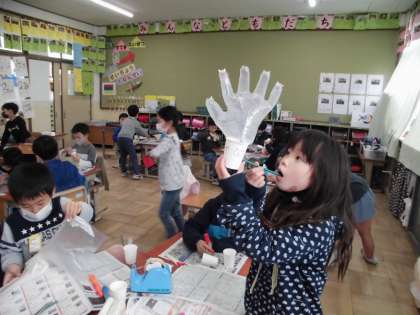 紙コップに細長いビニール袋やビニール手袋を入れて,ストローでつなげて,息を吹いてふくらませると,にょきっと立ち上がる,その面白さを生かした題材です。
