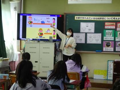 今日は,今年度最後の食の学習がありました。栄養教諭の福井先生にお世話になり,「京都で伝統野菜について知ろう」という学習をしました。
