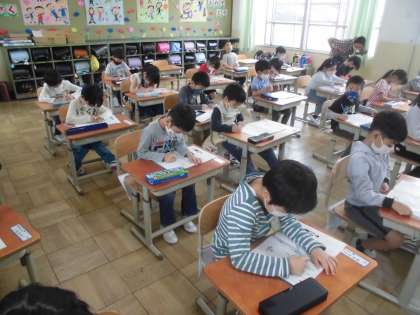 「こし・ぴん。」「あし・ぺた。」「ぐう・ひとつ。」書く姿勢を意識しています。