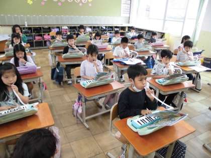 2年生になって初めての音楽では,歌を歌ったり,けんばんハーモニカをふいたりしました。