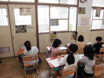 今日の図画工作では,感じた春を絵で表しました。校門に咲く桜は,もう葉桜になってしまっていますが,撮影したものを見ながら,春を感じていました。