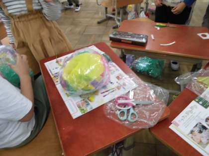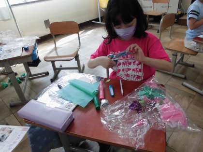 3年図画工作科「カラフルフレンド」の学習では,形や色などの感じを基に,自分のイメージをもって,ビニル袋の中にいろいろな色の材料を入れて色の重なりや形の面白さを生かして作品を作りました。