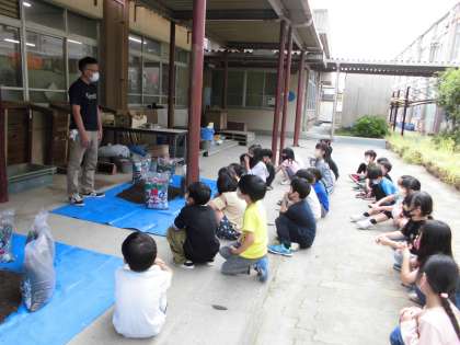 大将軍小学校では,地域におられるお米マイスターの高田さんに教えていただきながらお米づくりをしています。