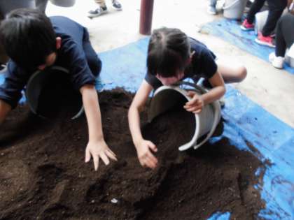 今日は田おこしをしました。土を混ぜて,一人一つのバケツに土を入れました。
