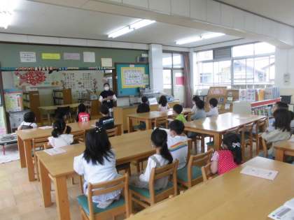 はじめての図書館学習です。学校司書の先生に,図書館の使い方や約束を教えていただきました。どこにどんな本があるのか見てまわり,気に入った本をよく読んでいました。これから,毎週図書館で本を読み,借りていきます。