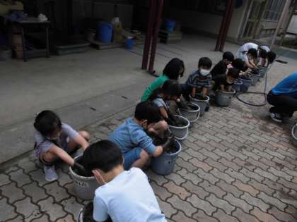 バケツの土と水を手で混ぜていきます。中の土が固く,重たく少し苦戦する様子も見られました。