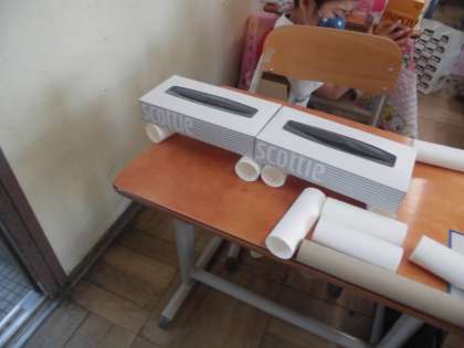 ご準備いただいたお菓子の箱や容器,ペットボトルなどを使って,形の学習をしました。「動物や乗り物をつくる」中で,形にはいろいろなものがあることに気づけました。
