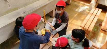 いよいよ火おこしスタートです。軸がブレないように,力を入れて速く上下に動かします。