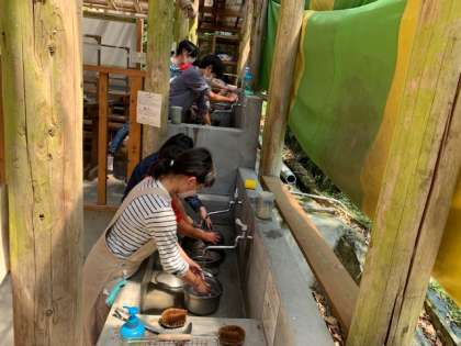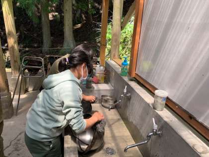 食べ終わった後は片付けです。炭で真っ黒になった鍋を洗うのは大変でしたが,ピカピカになるまできれいに洗うことができました。