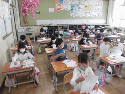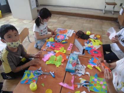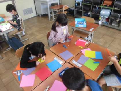はさみの使い方を学び,練習してから,かざりをつくりました。おりがみを折って,切って,広げてみると,素敵な形ができました。