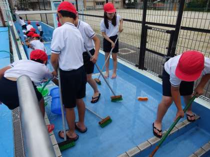 もうすぐ始まる水泳学習のために,プール清掃をおこないました。5年生はプールの入り口と足や腰を洗う場所をきれいにしました。