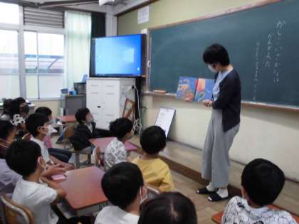 今日の朝学習では,図書ボランティアの方に来ていただき,本を読んでいただきました。『かしこいさかなはかんがえた』という本でした。