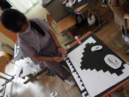 紙をはさみで切り,いろいろな形ができることに気づきました。