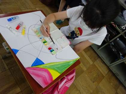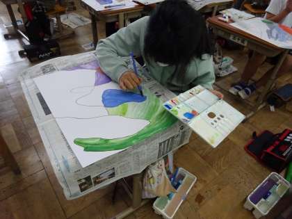 5年生は,図画工作科の学習で「心のもよう」を絵に表しました。赤・黄・青・白の4色から色を作ったり,水の量を変えて濃さを変えたりして,たくさんの工夫をしました。