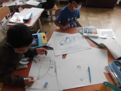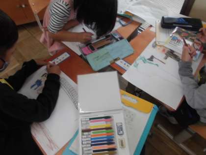 学校で働く人と仲よくなるためにインタビューしたことを,絵で描いています。どんなことが分かったのか,みんなで交流します。うまく伝えることができるように,がんばっています。