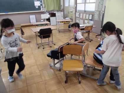 「ロンドン橋落ちた」や「頭,肩,ひざ,ぽん」などに合わせて体を動かす活動をしています。曲のテンポが速くなると,リズムに合わせることが難しくなりますが,子どもたちは楽しく活動をしていました。
