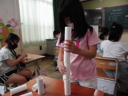 生活科「あそんで ためして くふうして」では、集めたものの特徴を生かして遊んでいます。遊びながら、気が付いたことや思ったことを近くの友だちと伝え合っている姿が印象的です。