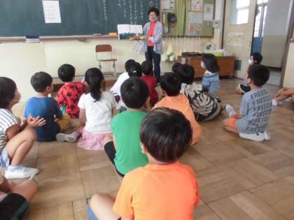 『まいごのたまご』の絵本の読み聞かせをしていただきました。いろいろな恐竜が出てくるところで、子ども達の目がキラキラしていました。ありがとうございました。