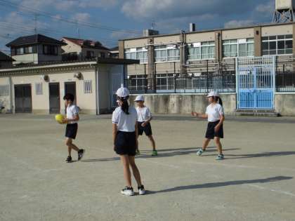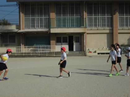 初めて使うボールと、前に投げることができない子も多かったですが、グループで練習していくうちにどんどん慣れていきました。