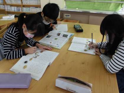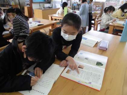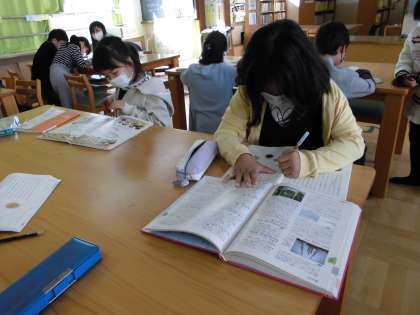 3年国語科「すがたをかえる大豆」の学習で、自分たちの分からない言葉を国語辞書や百科事典使って調べ学習を行いました。