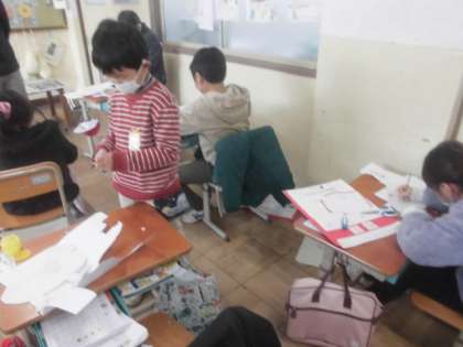 にわとりを題材に、紙版画にチャレンジしています。パーツごとに画用紙を切って、貼って、つくっています。できたにわとりに、インクをつけて刷ってできた版画に「おおーっ。」という歓声が上がりました。教室に掲示していますので、参観・懇談会の際に見ていただこうと思います。楽しみにしていてください。