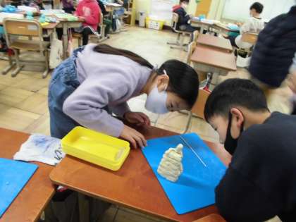 今日の図画工作科では、1年間で頑張ったことや楽しかったことを思い出し、思いに合う形を見つけ、表しました。自分の思いは文や絵で表すことが多いですが、初めて粘土で表すということをした子どもたちはわくわく楽しんで活動していました。