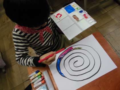 ハサミや絵の具の使い方を思い出し、「へびくんのおさんぽ」というお話に出てくるへびくんにカラフルな服を着せてあげようと、絵を描きました。