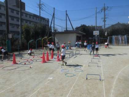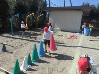 先週に続き、運動場の体育倉庫のものを「並べて」楽しみました。体育館よりもさらに大きな空間で、思い切り活動できました。