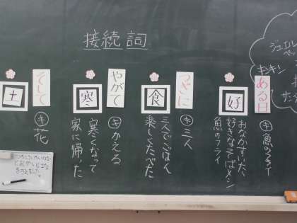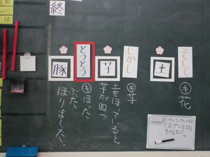 自分が好きな漢字を選んでお話づくりをしています。一人一つずつお話を考えて、「つぎに」「しかし」などの接続詞を使って文章をつないでいきます。作ったお話を聞いて、感想や分かったことを伝えることも頑張って取り組んでいます。次はどんなお話が聞けるのか楽しみです。
