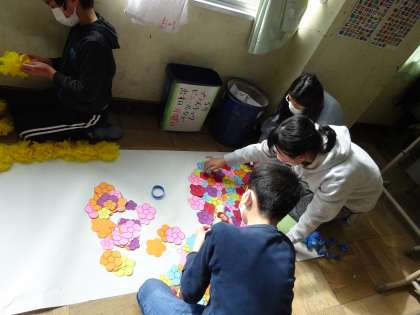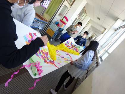 5年生は、卒業する6年生に向けて「おめでとう」と「ありがとう」の気持ちを込めて2種類のおめでとう掲示を作りました。何を作るのか、どんな風に作るのかもすべて子どもたちで企画し、進めていきました。製作時間も限られた中でしたが、みんながそれぞれの力を出し切り、素敵な掲示ができました。