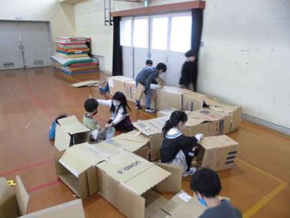 今日は体育館で図画工作をしました。段ボールを切ったり、穴をあけたりして、考えたり思いついたものを工夫してつくりました。初めての段ボールカッターも扱い方に注意して、上手に使うことができていました。