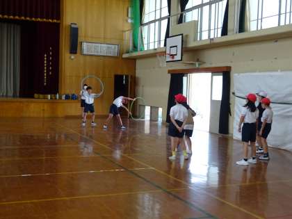 指定されたアイテムを使って、グループの友達と協力して体ほぐしのメニューを考えました。「こんなふうにやってみたらどうかな。」「いいね。」とたくさん声をかけあいながら、考える姿が見られました。