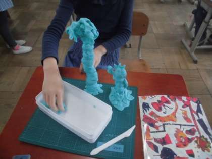 「ねん土を立ち上がらせて作品をつくろう」というめあてで学習しました。積み重ねたり、伸ばしたり、合体させたり、いろいろと試しながら進めました。テーマを見つけたり、高く立ち上がらせたりして、楽しむことができました。