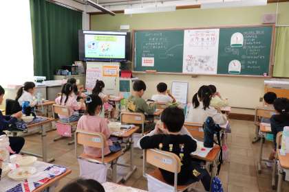 栄養教諭の太田先生の食のクイズや話を聞きながら、今日もおいしく楽しく給食時間を過ごしました。