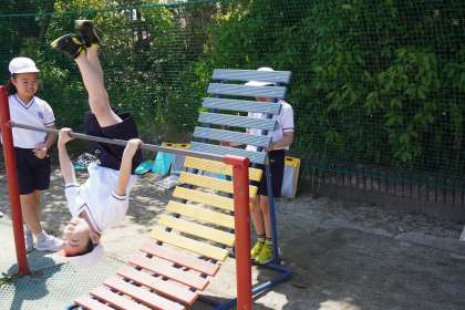 「てつぼう運動」の学習では、できるようになりたい技を自分で設定して、どうすればできるようになれるのかを考えながら友だちと学び合って学習しています。逆上がりに挑戦している児童が多く、補助具を用いながら回る感覚をつかもうと意欲的に取り組んでいます。