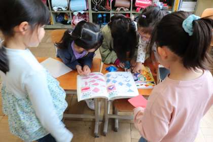 雨の日は折り紙を楽しんでいます。本で調べたり、教え合ったり、かぶとやこいのぼりを作っていました。
