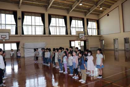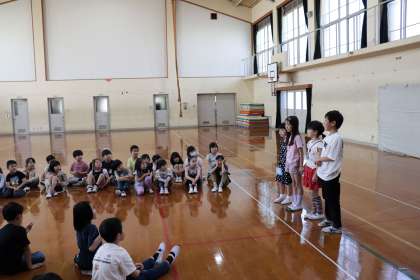 2年生の子どもたちが進行し、今年のなかよしグループの発表をしたり、じゃんけんあそびをしたりしました。
