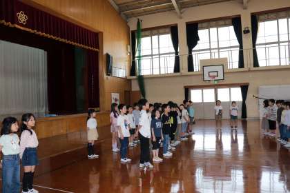 はじめのあいさつのあと、みんなで校歌を歌いました。