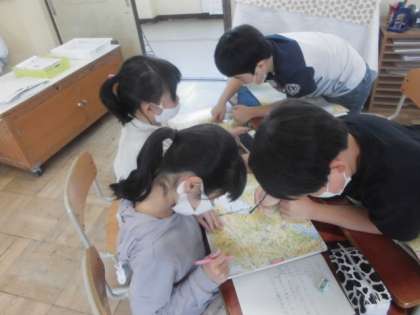 京都府の土地の様子を白地図に表しました。そこから考えられる土地利用について予想し、調べ、話し合いました。「低地は平地が広がっているので市街地が多い。」「農地は水が必要なので川沿いに広がっている。」「京都市は人が多く住み、交通も発達している。」など、いろいろなことに気づくことができました。