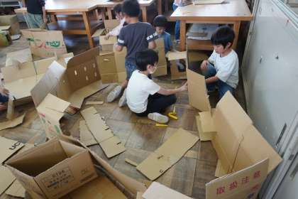 「クミクミックス」という学習をしました。段ボールをとにかく組み合わせて造形を楽しみました。一人でつくったり、大人数でつくったり、小さいものを組み合わせたりダイナミックに大きいものを組み合わせたり、想像したことを表現していました。