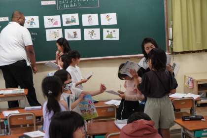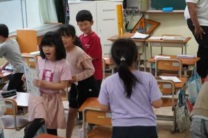 「How are you?」の学習をジョシュア先生とともにおこないました。「come here.」のジェスチャーはやり方を間違えると「go away.」の意味になることを学び、驚いていました。コミュニケーション活動では、ジェスチャーと表情と声色を工夫して、最大限に気持ちが伝わるように考えてやりとりをしました。「もっとやりたかった!」という声がたくさん聞かれ、とても楽しく学習ができました。