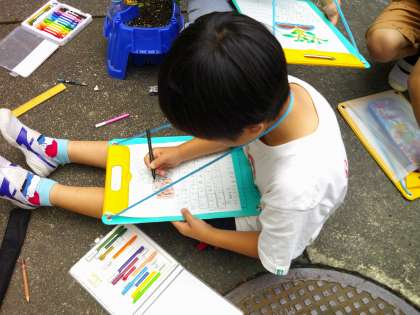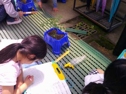 先日,自分の植木鉢にミニトマトの苗を植えました。どのミニトマトも元気に育っています。昨日は自分のミニトマトの背の高さを調べたり,葉の形をしっかり見たり,名前をつけたりしました。観察カードに一生懸命書きこむことが出来ました。