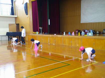 今日は,雨が降っていたので体育館で練習しました。いつもの練習メニューに加えて,クラウチングスタートの練習もしました。