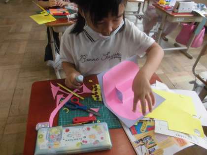 「ありがとう」「おめでとう」「また遊ぼう」など、いろいろな気持ちを伝えたい人にカードをつくりました。とび出すしくみを利用して、工夫して、楽しく活動しました。