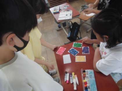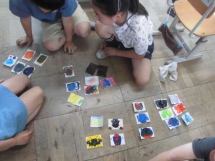 小さな画用紙に、指で絵の具を混ぜることで、色が混ざり合う面白さを味わいました。「混ざり合う境目がおもしろい。」「きれいな色ができた。」「色がかすれるのもおもしろい。」「すごい形になった。」など、いろいろな声が聞こえてきました。