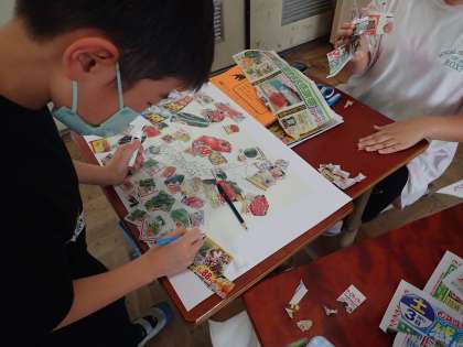 今日は、各家庭から持ちよったスーパーの広告に載っているものの生産地調べをしました。