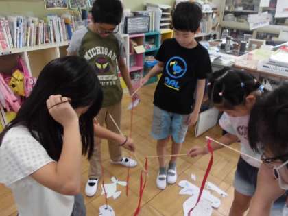 3くみで屋台を手作りして、学校の友達や先生を招待しようという学習に取り組んでいます。まずは自分たちがいろいろな遊びを体験しようということで、今回は魚や釣竿を簡単に手作りしてつりをしてみました。大物を釣り上げたり、数を釣り上げたりととても盛り上がり、楽しく学習することができました。