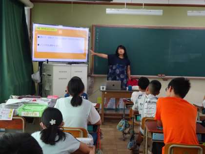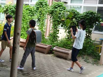 後半は、グループに分かれて学校の教室を紹介する動画を撮りました。