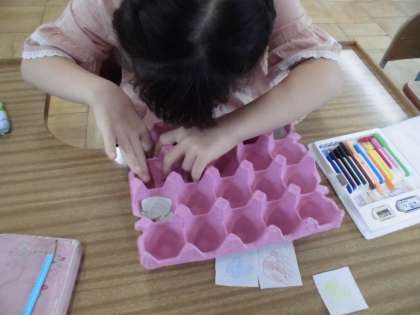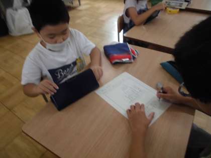 3くみのオリジナル屋台を作って、学校の友だちや先生を招待しよう!という学習に取り組んでいます。お祭りってどんなもの?こんな屋台知ってる!から始まり、いろいろな遊びを経験するお試しパート、作りたい屋台のテーマ、必要なものや材料を考え、設計図にまとめる計画パート、実際に作ってみる実行パートと順番に進めています。人に楽しんでもらうにはどんなゲームで、どんな見た目がいいかなどを考えながら、楽しんで学習に取り組んでいます。