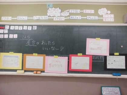 瑞饋祭りの屋台を見に行ったり、3くみまつりを進めたりとお祭りについて学習する中で、あったらいいな!と思う屋台を考え、絵にしました。それぞれの個性があふれた屋台が出来上がっていました。自分で値段設定を考えている子や、違うジャンルの商品を入荷している子などが出てきて、とても楽しく活動できました。